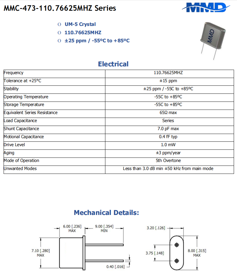Mmdcomp插件石英晶體,MMC-473-110.76625MHZ,電話機(jī)6G晶振,通訊設(shè)備晶振,小體積晶振,參數(shù)表