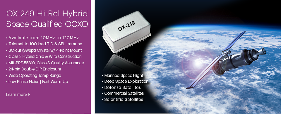 說到OCXO晶振在航天航空上的應用,讓我想到美國的Vectron國際公司。美國Vectron International(維管國際)是世界領先的頻率控制、傳感器和混合產品解決方案的設計、制造和營銷的領導者,總部設在美國密歇根哈德遜,產品包括晶體和晶體振蕩器,頻率轉換器,時鐘和數據恢復產品,表面聲波濾波器,晶體濾波器和用于電信、數據通信、頻率合成器、定時、導航、軍事、航空和儀表系統的組件。在水晶振蕩器和濾鏡設計方面都以其技術能力而聞名。公司提供的創新和能力反映了高頻率、低成本設計和小型化的趨勢,以及更先進的綜合解決方案。其中一些關鍵技術包括: ASIC設計、表面安裝技術、陶瓷封裝、混合制造到類“S”、“高頻基礎”(HFF)晶體設計和空間組件能力。美國威克創國際擁有突出的高頻基協波和SC切割晶體的離散晶體技術,及100級和10000級潔凈室設施生產領先前沿的陶瓷包裝VCXO晶振。Vectron國際公司的核心技術包括經典水晶、表面聲波濾波器技術和復雜的集成電路和先進的包裝。Vectron晶振最新的 OX–249晶振用普通的太空用途的溫補晶振的封裝實現SC切割恒溫晶振的性能,填補了存在于小體型、低能量和大尺寸、高能量的太空用途的恒溫晶振之間所呈現的成本、尺寸、性能的缺口, Vectron國際的方案實現了性能和小型化的有力結合。OX–249晶振主要用于人造空間飛行器、深度空間探測、國防衛星、商業衛星和科學衛星。