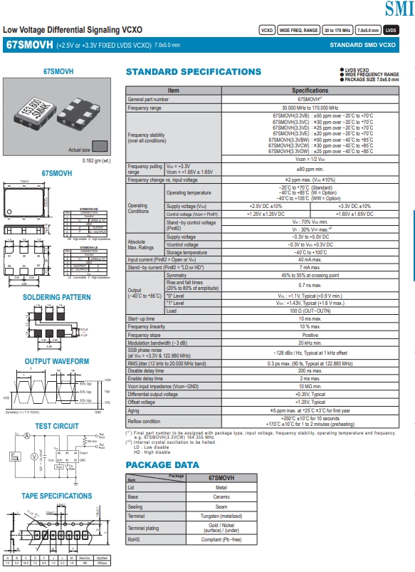 SMI晶振,SMI振蕩器,67SMOVH壓控振蕩器.貼片式石英晶體振蕩器,低電壓啟動功率,并且有多種電壓供選擇,比如有1.8V,2.5V,3.3V,3.8V,5V等,產品被廣泛應用于,平板筆記本,衛星系統,光纖通道,千兆以太網,串行ATA,串行連接SCSI,PCI-EXPress的SDH / SONET發射基站等領域.符合RoHS/無鉛.