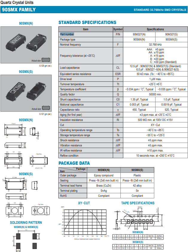 SMI晶體,千赫茲石英晶體,90SMX(N)諧振器.該類產品特性如耐熱性,耐沖擊性,在辦公自動化,家電相關電器領域及Bluetooth,Wireless LAN等短距離無線通信領域可發揮優良的電氣特性,滿足無鉛焊接的回流溫度曲線要求.