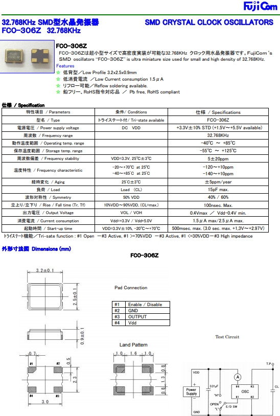富士晶振,32.768KHz,FCO-306Z壓電石英晶振.小型,薄型,質地輕的表面貼片音叉型晶體振蕩器,手機晶體,產品體積小,特別適用于各種小巧的便攜式消費電子數碼產品,在移動通信領域廣泛的應用,晶振產品本身可發揮優良的電氣特性,滿足無鉛焊盤的高溫回流溫度曲線要求.